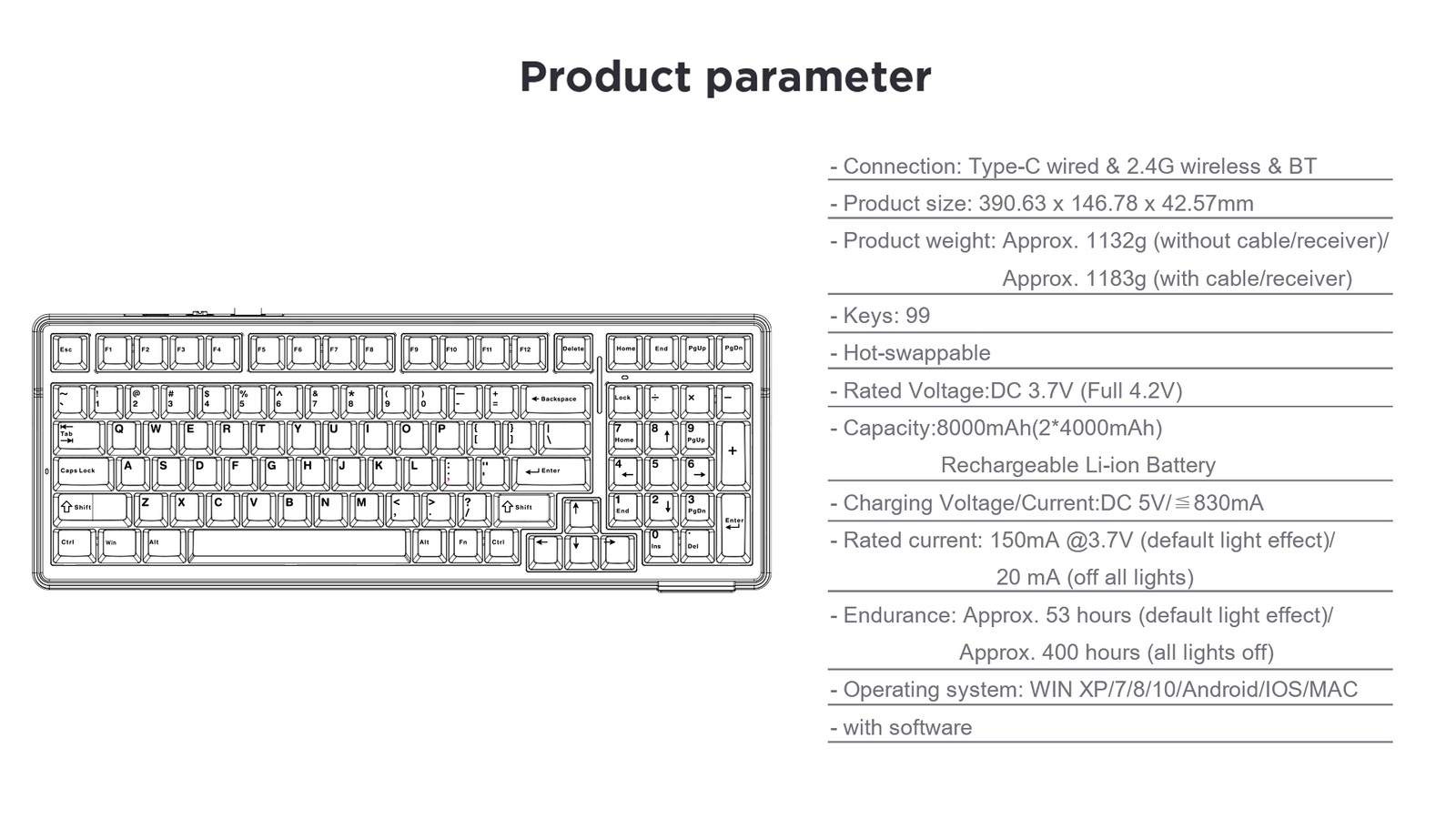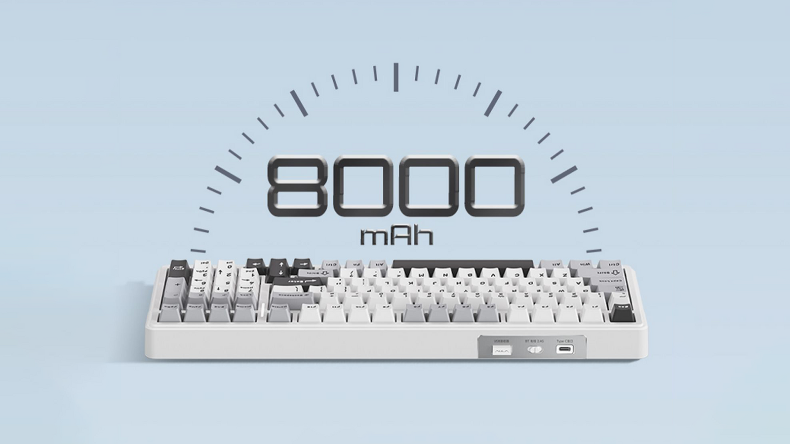 l  PBT キーキャップと 8000mAh バッテリー: 耐久性があり鮮やかな PBT キーキャップと、長時間使用できる長持ちする 8000mAh バッテリー。