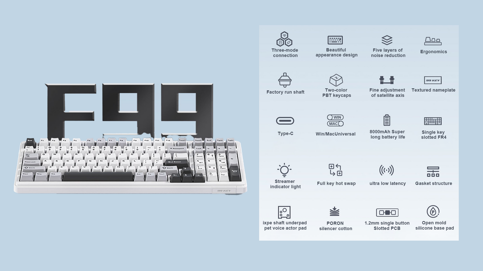 F99 キーボードは、3 モード接続 (Bluetooth、2.4GHz、有線)、耐久性のあるガスケット マウント構造、完全にホットスワップ可能なキー、コンパクトな 95% レイアウトを兼ね備えています。完璧な汎用性を備え、シームレスなパフォーマンス、カスタマイズ、省スペースの効率性により、ゲーム、e スポーツ、プロフェッショナルの生産性を向上させるように設計されています。