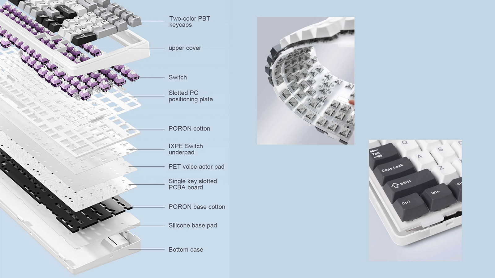 l  ガスケット構造: シリコンパッドと防音層を統合し、安定性を高め、より柔らかく静かなタイピング感覚を実現します。